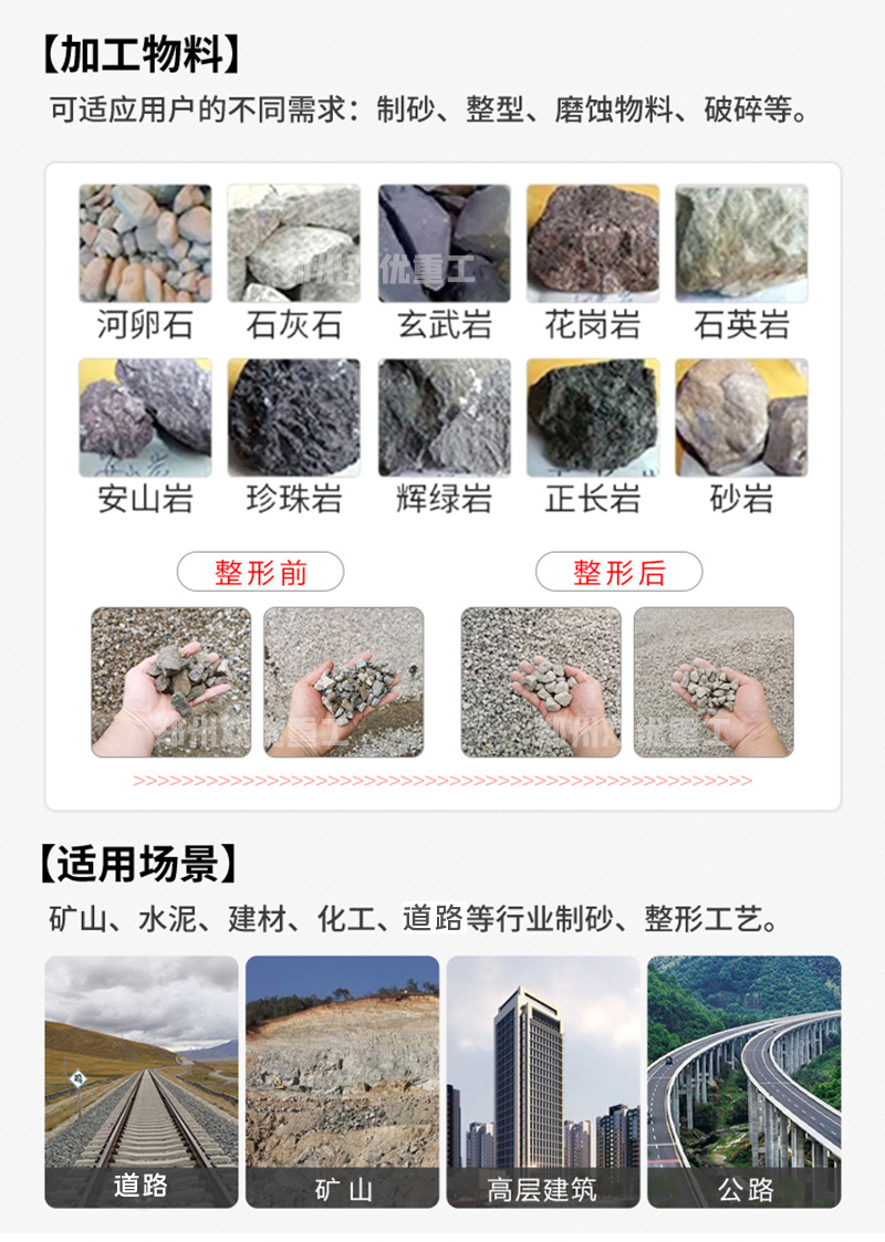 【應(yīng)用范圍】:礦山、水泥、建材、化工、鐵路等行業(yè)制砂、整形工藝。